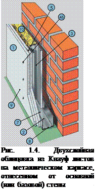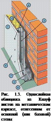 Однослойная облицовка из Кнауф листов на металлическом каркасе, отнесенном от основной (или базовой) стены приведена на рис. 1.3 (номера позиций указаны в табл.1.3).