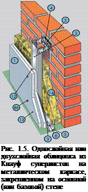 Однослойная или двухслойная облицовка из Кнауф суперлистов на металлическом каркасе, закрепленном на основной (или базовой) стене приведена на рис. 1.5 (номера позиций указаны в табл.1.5).