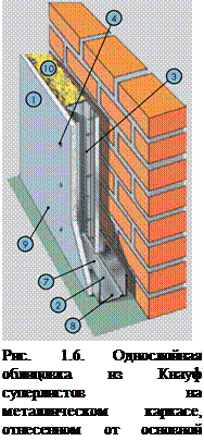 Однослойная облицовка из Кнауф суперлистов на металлическом каркасе, отнесенном от основной (или базовой) стены приведена на рис. 1.6 (номера позиций указаны в табл.1.6).