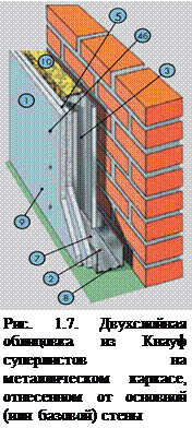 Двухслойная облицовка из Кнауф суперлистов на металлическом каркасе, отнесенном от основной (или базовой) стены приведена на рис. 1.7 (номера позиций указаны в табл.1.7).