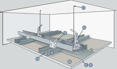 Отличительные особенности данной системы: основные профили каркаса подвесного потолка, закрепленные с использованием подвесов к базовому потолку, и несущие профили, к которым крепится гипсокартонный КНАУФ-лист, расположены в разных уровнях.