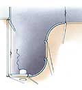 Рассмотрим порядок выполнения закругленного угла. Прежде всего необходимо изготовить шаблон, по которому производится изгиб ГКЛ (рис. 12). Из гипсокартона вырезаются два боковых элемента необходимого радиуса (он должен быть чуть меньше радиуса изгиба ГКЛ).