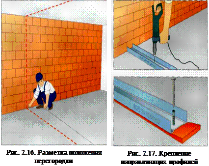 Разметить проектное положение перегородки по полу, потолку и базовым стенам. Стены, пол и потолок должны быть чистыми и сухими в местах расположения перегородки (рис. 2.16).