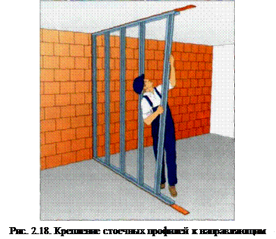 4. Установить и закрепить дюбелями стоечные профили (ПС). Их вставляют в нижний, затем в верхний профили с шагом 600 мм (рис. 2.18). Стойка должна входить в направляющую на потолке минимум на 20 мм.