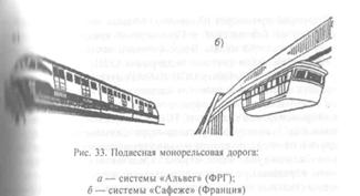 Современная монорельсовая дорога состоит из железобетонной или металлической балки, опирающейся на бетонные опоры, и подвижного состава с колесами на пневматическом малошумном ходу (рис. 33). Известны дороги системы «Альвег» (ФРГ), у которых подвижной состав находится сверху балки, и системы «Сафеже» (Франция) с вагонами, подвешенными к тележкам снизу балки.
