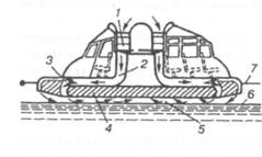 1 — нагнетатель; 2 — воздушная шахта; 3 — воздушный канал; 4 — отсек плавучести; 5 — воздушная подушка; б — ватерлиния при работающем вентиляторе; 7— ватерлиния при неработающем вентиляторе