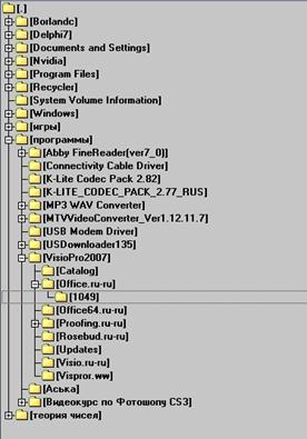На рисунке изображена древовидная файловая структура. Для того, чтобы получить доступ к файлам, находящимся в папке 1049, необходимо сначала открыть папку «программы», «VisioPro2007», «Office.ru-ru». В папке 1049 есть файл Readme.txt. Полное имя файла будет выглядеть следующим образом: