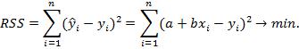 Согласно методу наименьших квадратов (МНК) неизвестные параметры модели выбираются таким образом, чтобы сумма квадратов отклонений эмпирических значений от модельных была минимальной: