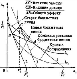 Пусть цена первого блага повысилась с Р11 до Р21, тогда бюджетная прямая из положения 1 перейдет в положение 2. Точка А на линии безразличия1t1, касающейся первоначального бюджетного ограничения, будет заменена новой точкой оптимума В, где новая линия безразличия 1t2 касается новой бюджетной прямой. Если мы хотим компенсировать потребителю потерю благосостояния, то увеличим его доход так, чтобы новая бюджетная прямая 3 (параллельная линии 2) коснулась в некоторой точке С прежней линии безразличия 1t1. Направленный отрезок АС показывает «эффект замены» при росте цены, т. е. изменения структуры спроса при условии поддержания прежнего уровня благосостояния. Направленный отрезок ВС отражает «эффект дохода», т. е. изменение потребительского спроса при сохранении соотношения цен благ и изменении уровня дохода. Общий результат роста цены (при отсутствии компенсации) выражается направленным отрезкомАВ.