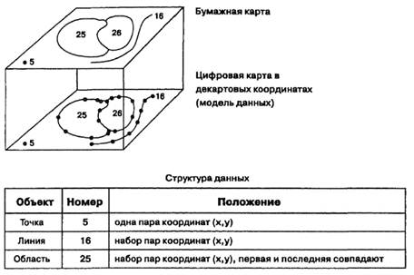 Такая модель данных для описания точечных, линейных и полигональных объектов носит наименование модели «спагетти» (Рис.). Она не является эффективной с точки зрения неизбыточности хранимых данных и возможностей использования аналитических операций ГИС и поддерживается недорогими программными средствами настольного картографирования и ГИС.