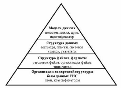 Уровни организации данных можно представить в виде пирамиды (см. рис.). Модель данных – это концептуальный уровень организации данных. Рассмотренные ранее термины, типа “полигон”, “узел”, “линия”, “дуга”, “идентификатор”, “таблица” как раз относятся к этому уровню, в равной степени, как и понятия “тема” и “слой”.