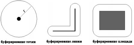 В современных ГИС буферные зоны создаются автоматически, причем построить их можно вокруг объектов любых типов. Говоря проще, буферные зоны – это могут быть эпидемиологические зоны, зоны техногенных катастроф (розлив нефти, авария на атомной станции), зоны дальнего действия различных радиотехнических устройств и систем и т.д.