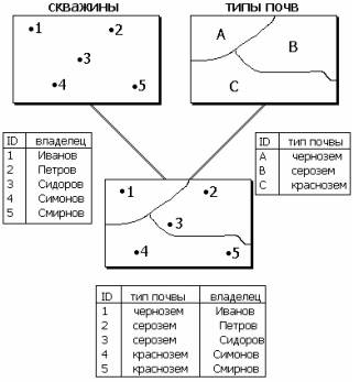 Примером оверлейной операции служит операция топологического оверлея “точка-в-полигон” (point-in-polygon). По существу происходит наложение двух слоев, в результате чего образуется новый слой.