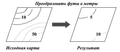 Следующее переклассификационное условие – значение какой-либо величины (высота над уровнем моря, зональная температура, количество осадков), отображаемой на карте. Например, на карте нужно изменить футы на метры.