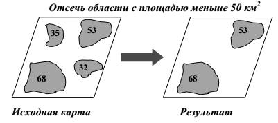 Переклассификация часто производится по размеру объектов. Например, на слое карты необходимо убрать объекты, площадь которых ниже либо выше заданного значения.