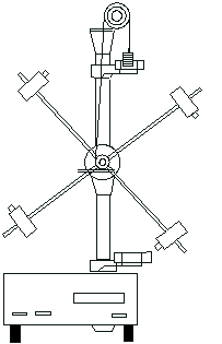 Маятник Обербека представляет крестовину, укрепленную на двойном шкиве. Ось вращения крестовины устанавливается горизонтально и закреплена в подшипниках (рис. 15). Вращение прибора осуществляется с помощью нити, намотанной на шкив. Изменение силы натяжения производится с помощью грузов различной массы, прикрепленных к свободному концу нити. Изменение момента инерции прибора достигается передвижением четырех грузов одинаковой массы и формы по направляющим крестовины. Уравнение вращательного движения прибора (при пренебрежении силами трения) связывает три величины: момент силы натяжения нити, угловое ускорение и момент инерции прибора Момент силы натяжения нити и угловое ускорение можно вычислить, зная ускорение а поступательного движения подвешенного груза.