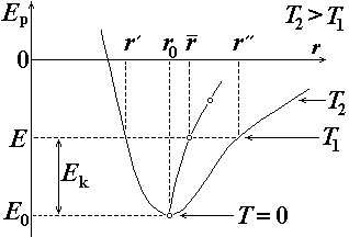 При некоторой температуре Т1, не сильно отличающейся от нормальной температуры Т0 = 273,15 К, которой по шкале Цельсия соответствует температура t = 0°C, суммарная кинетическая и потенциальная энергия атома равна Е. Это означает, что в процессе колебаний расстояние между атомами изменяется от