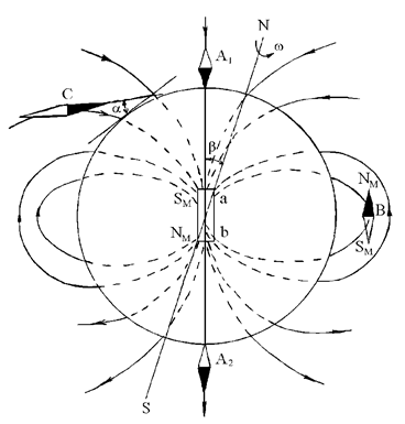 Магнитное поле Земли в первом приближении совпадает с магнитным полем диполя “ab” (прямого магнита с некоторым магнитным моментом Pm), помещенного в центре Земли (рисунок 1).