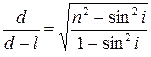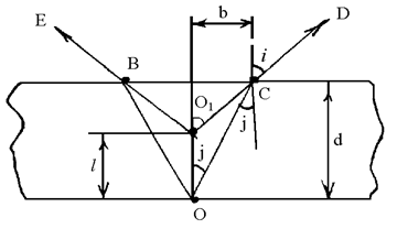 Наблюдатель рассматривает точку О через пластинку толщиной d. Проведем из точки О два произвольных луча ОB и ОС. После преломления эти лучи пойдут по направлениям СД и ВЕ. Наблюдая сверху, мы увидим изображение точки О на пересечении продолжения лучей ДС ВЕ, т.е. в точке О1. Таким образом, точка О покажется нам расположенной ближе на величину ОО1 = l. Найдем связь между n ., d и толщиной кажущегося поднятия точки l. Из рисунка 1 находим: