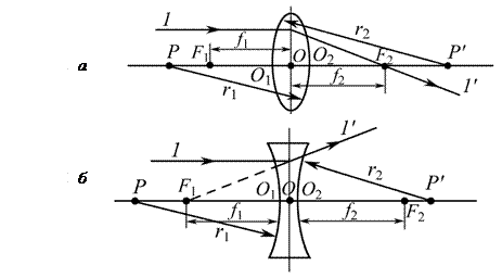 Линза – это один из основных элементов оптических систем, предназначенных для получения оптических изображений. Она представляет собой оптически прозрачное тело, ограниченное с двух сторон сферическими поверхностями. Если расстояние О1О2 (рис. 1) между этими поверхностями значительно меньше радиусов кривизны, то линза называется тонкой. Ее вершины О1 и О2 в этом случае можно считать совпадающими в точке О, называемой оптическим центром линзы. Причем ось, проходящая через оптический центр линзы и центры кривизны ее преломляющих поверхностей, называется главной оптической осью линзы (прямая РР¢, рис. 1).