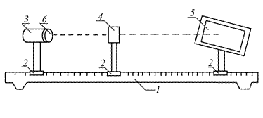 Главное фокусное расстояние тонких линз можно измерить различными способами. Для этой цели используется установка, представленная на рис. 2. Установка состоит из оптической скамьи 1, на которой с помощью рейтеров 2 располагаются осветитель 3, исследуемая линза или система линз 4 и экран 5. Оптическая скамья снабжена шкалой для измерения положения осветителя, линз и экрана. В качестве предмета, изображение которого проектируется линзой на экран, используется сетка 6, расположенная в передней части осветителя.
