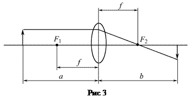 Располагая на оптической скамье собирающую линзу, получим на экране действительное изображение предмета. При этом ход лучей в линзе имеет вид, представленный на рис. 3.