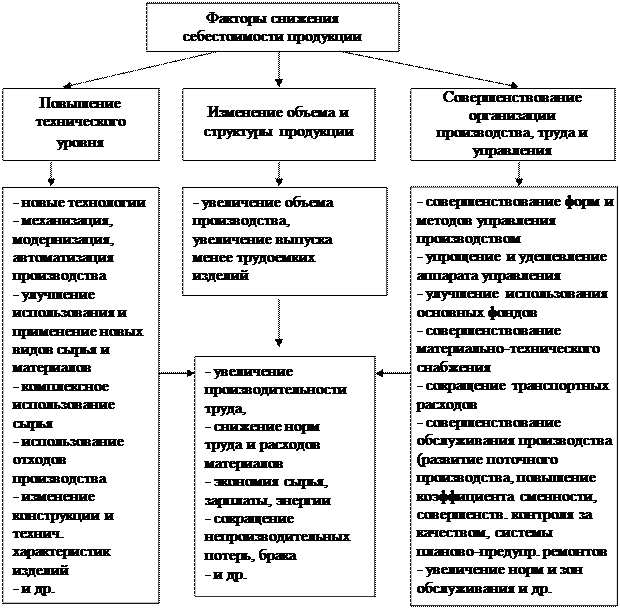 Совершенствование организации производства и труда. Снижение себестоимости может произойти в результате изменений в организации производства, формах и методах труда при развитии специализации производства; совершенствования управления произ-водством и сокращения затрат на него; улучшения использования основных фондов; улучшения материально-технического снабжения; сокращения транспортных расходов; прочих факторов, повышающих уровень организации производства.