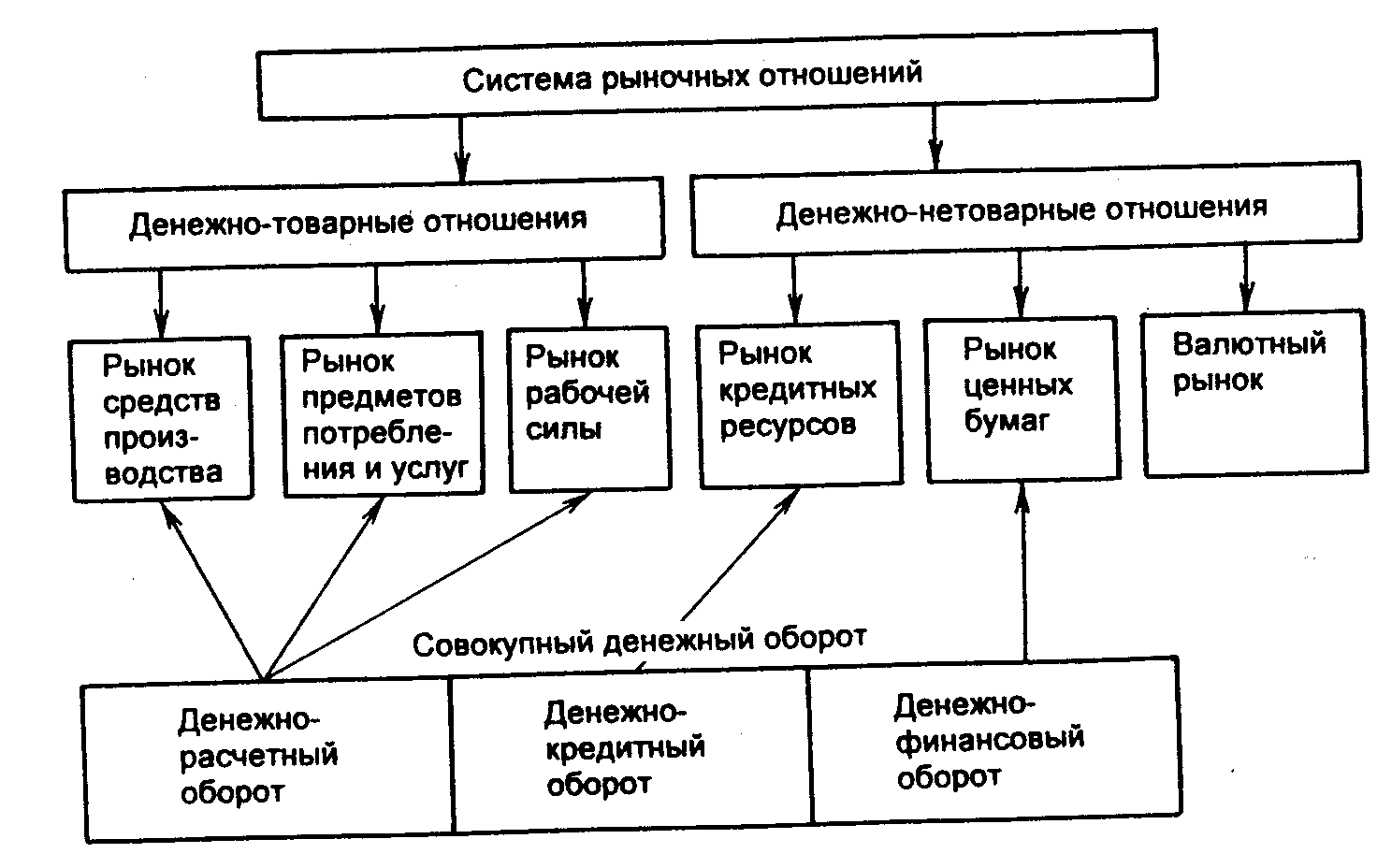 Как видно из рисунка, система рыночных отношений распадается на две сферы: денежно-товарных и денежно-нетоварных отношений. Особенностью денежно-товарных отношений является то, что происходит не только денежный, но и товарный (стоимостной) обороты, поскольку движение денег здесь всегда связано со встречным движением товаров.