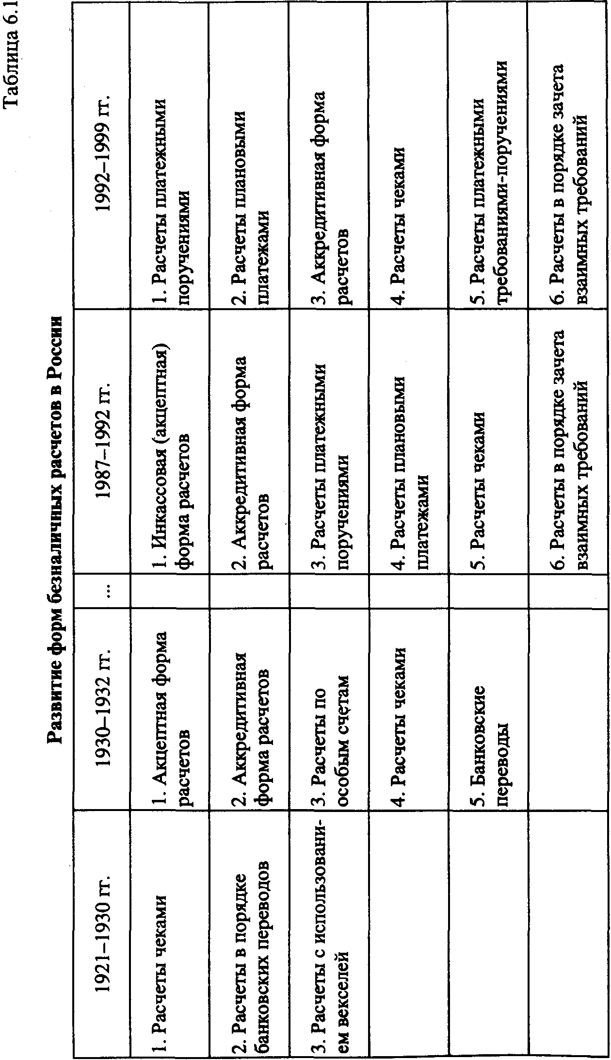 Развитие форм безналичных расчетов в историческом аспекте представлено в табл. 6.1. После Октябрьского переворота 1917 г. в нашей стране происходили глубокие преобразования в экономической жизни общества. Была реформирована банковская система; серьезные изменения затронули денежно-кредитную систему в связи с гражданской войной, военной интервенцией и, позднее, переводом экономики на мирные рельсы. В этот период, несмотря на сужение сферы товарно-денежных отношений, все же применялись безналичные расчеты с использованием векселей, чеков, выполнялись банковские переводы. Однако единой унифицированной системы безналичных расчетов в стране не существовало.