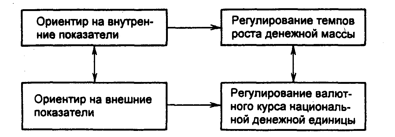 Одним из основных принципов определения стратегии центральных банков служит ориентация на регулирование темпа роста денежной массы в национальной экономике или регулирование валютного курса национальной денежной единицы по отношению к какой-либо стабильной иностранной валюте, т.е. на внутренние или внешние показатели (рис. 19.1).