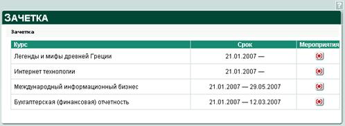 Выполните команду ОБУЧЕНИЕ->зачетка. В области отображения данных появится список курсов, по которым проходит обучение слушатель (Ошибка! Источник ссылки не найден.Рисунок 20), отсортированный по алфавиту. Для каждого курса указаны сроки обучения, определенные календарным планом.