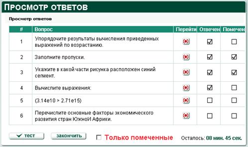 В списке вопросов (Рисунок 34) слушатель может просмотреть состояние каждого из вопросов (поля Отвечен и Помечен) и при необходимости перейти к любому из вопросов теста.