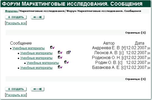 В поле Сообщение перечислены заголовки всех сообщений форума. Заголовок обычно отражает тему сообщения. В поле Автор указано имя пользователя, создавшего сообщение. Для каждого автора в квадратных скобках отмечена его роль в системе (т – тьютор, а – администратор, о – организатор, с – слушатель).