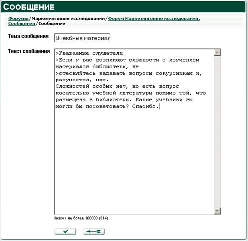 В поле Текст сообщения при ответе на сообщение представлен текст исходного сообщения. Автор ответа имеет возможность использовать в своем тексте цитаты из исходного сообщения.