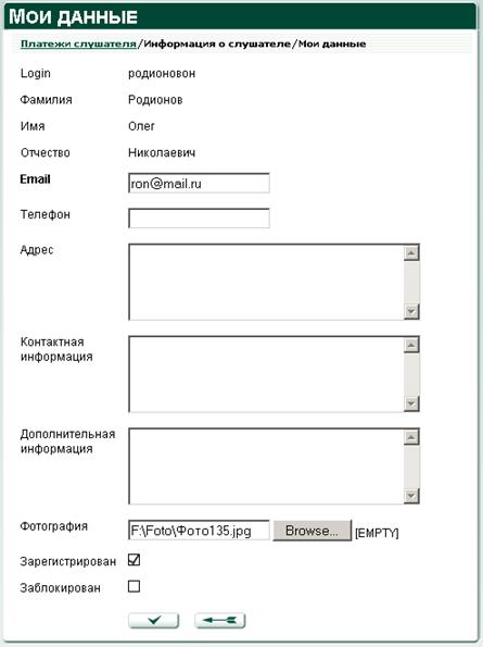 2) Внимательно перечитайте информацию в полях формы. Если все данные указаны верно, щелкните кнопку подтверждения (). В области отображения данных будут выведены измененные персональные данные (Рисунок 94).