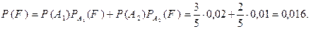 Пример. Объемы продукции, изготавливаемой двумя рабочими, относятся как 3:2. Вероятности брака для деталей первого и второго рабочих равны соответственно 0,02 и 0,01. Найти вероятность того, что деталь, извлеченная наудачу из не рассортированной продукции,