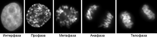 Клетки HeLa в интерфазе и на последовательных стадиях митоза