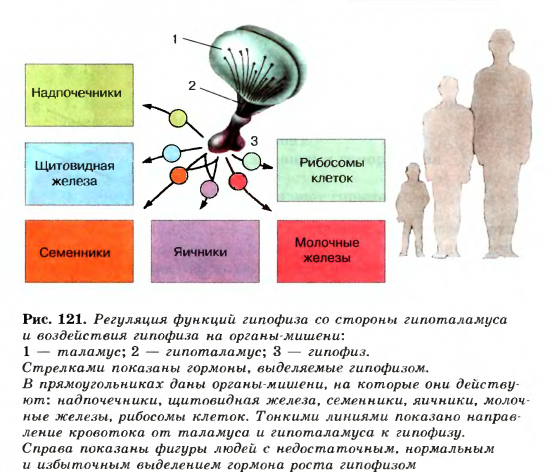 В промежуточном мозге расположен участок, называемый гипоталамусом (см. § 46). В нем есть нервные клетки, которые вырабатывают нейрогормоны. Особенность этих клеток в том, что их аксоны образуют синапсы в стенках кровеносных сосудов. И вещества, выделяемые синапсами, попадают в кровь. По кровеносным сосудам нейрогормоны с током крови попадают в центральную железу эндокринной системы — гипофиз. Он посылает свои гормоны другим железам, регулируя их работу так, что объединяются именно те органы, которые участвуют в данной функции организма (рис. 121).