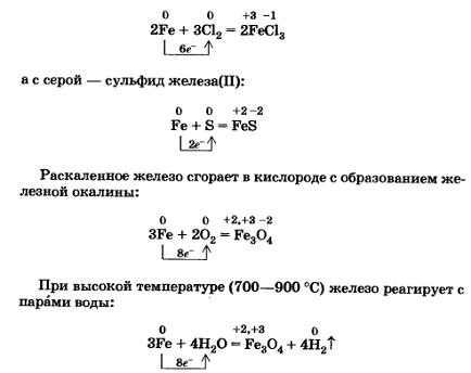 Переходя к описанию химических свойств железа, повторим, что оно может проявлять степени окисления +2 и +3, соответственно железо дает два ряда соединений. Число электронов, которое атом железа отдает при химических взаимодействиях, зависит от окислительной способности реагирующих с ним веществ. Например, с галогенами железо образует галоге-ниды, в которых оно имеет степень окисления +3: