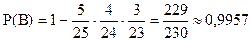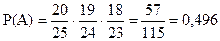 По условию: P(A1) = 20/25; P(A2/A1) = 19/24; P(A3/A2 ×A1) = 18/23.