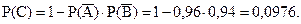 Р(С) = Р(А + В)= Р(А) + Р(В) - Р(АВ) = 0,04 + 0,06 - 0,0024 = 0,0976.