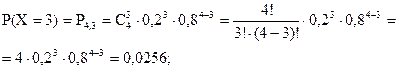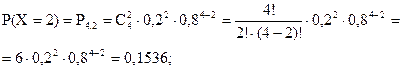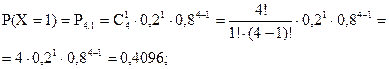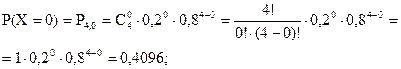 Очевидно, что случайная величина Х - подчиняется биномиальному закону распределения вероятностей с параметрами n=4 и p=0,2.