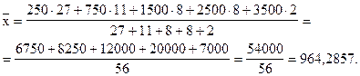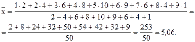 Так как частоты интервалов - разные, используем для расчета средней арифметической формулу (6.9). При расчете числовых характеристик интервального вариационного ряда в качестве значений признака принимаются середины интервалов.