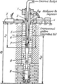 На практике наиболее широко применяется способ бурения с частичной аэрацией столба промывочной жидкости (рисунок 6.7). При этом сохраняется обычная технология бурения с промывкой и используются компрессоры низкого давления (0,6—0,8 МПа). Бурение по пласту осуществляется по обычной технологии с промывкой водой. Одновременно в кольцевой зазор между обсадной и дополнительной колоннами диаметром 127 или 146 мм нагнетается сжатый воздух, который через отверстия поступает внутрь дополнительной колонны труб, аэрирует находящуюся в ней промывочную жидкость и откачивает ее на поверхность. При таком способе бурения кольматации забоя происходить не будет при условии, что пластовое давление вод превышает суммарное давление столба промывочного раствора и воздушно-водяной эмульсии.
