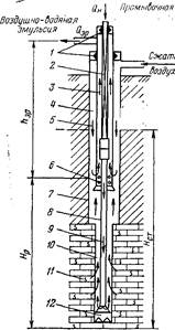 1 — устьевой герметизатор; 2 — ведущая бурильная труба; 3 — поток аэрированной жидкости; 4 — промежуточная колонна; 5 — поток сжатого воздуха; 6 — смеситель; 7 — обсадная колонна; 8 — бурильные трубы; 9 — поток промывочной жидкости; 10—ствол скважины; 11—серный пласт; 12 — долото шарошечное