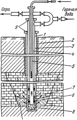 Основная сложность метода — разработка технологического процесса добычи серы для каждого конкретного месторождения. Добычные скважины бурят обычно буровыми станками и обсаживают трубами до сероносного пласта. Обсадную трубу цементируют и продолжают бурить рудное тепло на всю его мощность. В пробуренную скважину вставляют три концентрических трубопровода (рисунок 12.2) диаметром 168, 89 и 34 км. Верхнюю часть скважины оборудуют оголовком, обеспечивающим нагнетание горячей воды в пласт. Вода сквозь перфорации в нижней части проникает в сероносную залежь, разогревая серу. Расплавленная сера как более тяжелая стекает вниз и по серной трубе поднимается на высоту, равную гидростатическому давлению у почвы пласта. Благодаря подаче по дюймовой трубе сжатого воздуха сера эмульгируется и поступает на поверхность по серной колонне. Далее расплавленная сера направляется через отстойные резервуары и фильтры для очистки на склад готовой продукции. Все бассейны и трубопроводы, в которых циркулирует расплавленная сера, обогреваются.