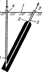 1 — поверхность земли; 2 — выход пласта под насосы; 3 — наклонная газоотводная скважина; 4 — наклонная скважина для нагнетания дутья; 5, 6 — концы обсадных колонн