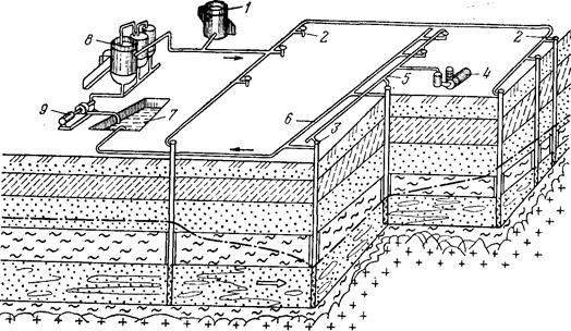 1 — узел приготовления раствора; 2 — нагнетательная скважина; 3 — дренажная скважина; 4—компрессор; 5—воздухопровод для эрлифта; 6 — коллектор для продуктивного раствора; 7 — отстойник; 8—установка для переработки раствора; 9 — насос
