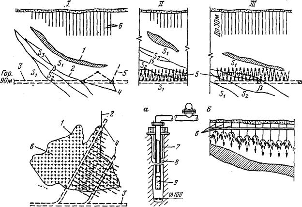 Рисунок 17.3 – Варианты (I — III) комбинированной системы подземного выщелачивания металла с подачей реагента в скважины-оросители, пробуренные с поверхности, и приемом продуктивных растворов в горные выработки