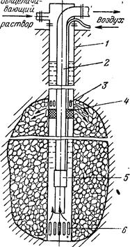 1 — эксплуатационная колонна; 2 — раствороподъемная колонна эрлифта; 3 — отверстия для подачи выщелачивающих растворов; 4—пакер; 5—смеситель эрлифта; 6 — отверстия для поступления продуктивных растворов